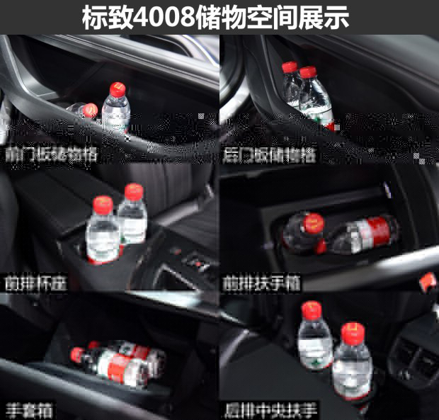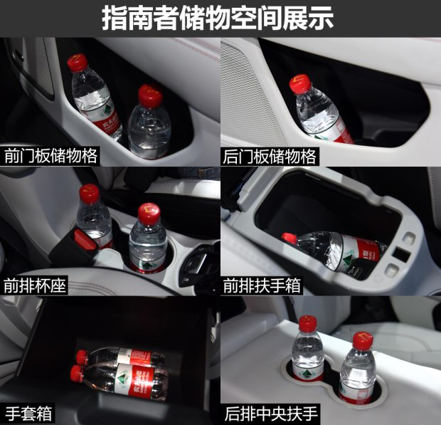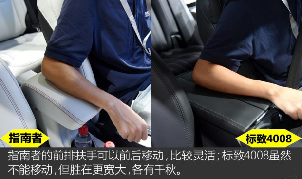 兩款車型的儲物格數量都差不多,只是細節設計方面有差異,指南者的前門板儲物格相對較小,并且只設置了一個杯座,而標致4008則可以同時放兩瓶水。另外,指南者的前排扶手箱同樣遜色于標致4008。綜合來看,標致4008在細節處理方面更到位。
