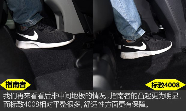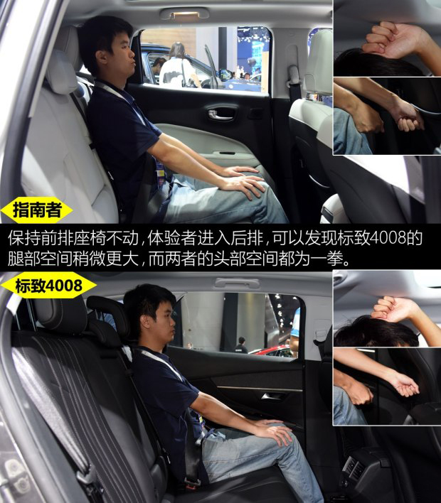 剛才在進行車身尺寸對比時,我們知道標致4008的軸距數據較指南者多了94mm。那么,它們的乘坐空間實際表現又如何呢?我們馬上來揭曉。