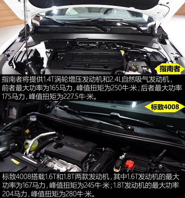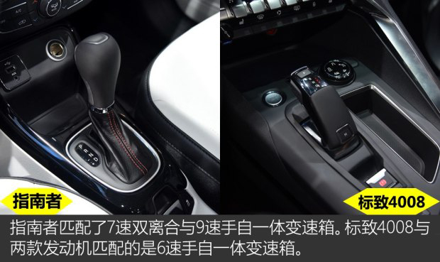 無論是指南者還是標致4008,它們都提供了兩款發動機給大家選擇。其中指南者為1.4T和2.4L,標致4008則為1.6T和1.8T。傳動系統方面,指南者匹配了7速雙離合與9速手自一體變速箱,而標致4008統一匹配6速手自一體變速箱。