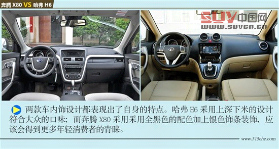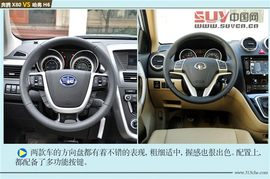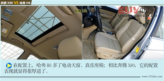 在配置方面表現上,哈弗H6的安全配置和舒適配置都要更加全面,而且相比奔騰X80的配置表現來說,前者具有更好的實用性,在配置環節,哈弗H6勝出。
