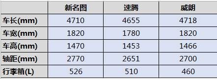 圖中可以一眼看出,新名圖的“三圍”尺寸在三款車中占據(jù)絕對優(yōu)勢,特別是在決定乘坐空間的軸距方面,2770mm的軸距出類拔萃,相比之下,威朗和速騰由于軸距尺寸的限制,車內(nèi)空間即使得到出色優(yōu)化,也根本無法與新名圖相提并論。