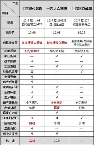 像消費者喜聞樂見且非常實用性的全景天窗、感應(yīng)后備廂、倒車影像都是新名圖所獨有的,對提高舒適性都很有效果的多連桿獨立后懸架、17寸輪轂配215寬胎,也只有名圖同時裝備,最為關(guān)鍵是這幾項配置中除了輪胎外都難以后期加裝。而反觀速騰所多出的胎壓監(jiān)測、定速巡航、真皮方向盤,或者可以后期加裝,或者在城市路況使用頻率極低,可有可無。客觀來說,名圖的配置很好的繼承了其“配置豐富乃至越級”的優(yōu)良傳統(tǒng),攻擊力十足。