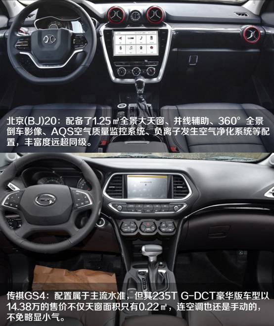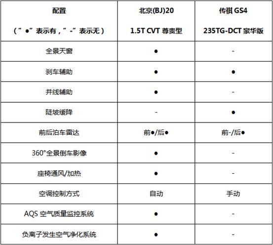 要想吸引年輕消費(fèi)者,車型的配置也不能少。為了方便比較,本次選擇了BJ20 1.5T CVT尊貴型和GS4 235TG-DCT豪華版這兩款排量相同、價(jià)格相近的車型進(jìn)行對比。