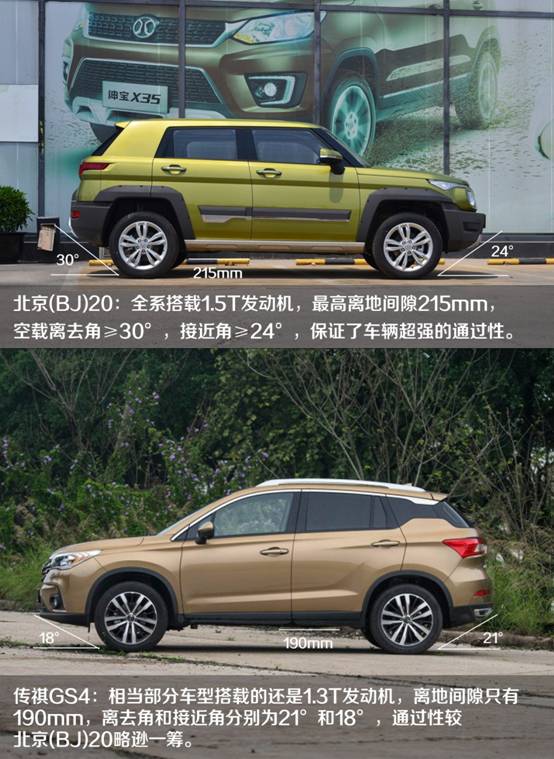 反觀GS4,在動力上有1.3T和1.5T兩種排量可供選擇,其1.5T發(fā)動機(jī)在動力參數(shù)上和BJ20相差無幾,實(shí)力相當(dāng),然而1.3T發(fā)動機(jī)最大輸出功率僅為101kw,最大扭矩202N·m,較BJ20略遜一籌,并且GS4離地間隙只有190mm,離去角和接近角分別為21°和18°,平時(shí)在城市通行倒是綽綽有余,倘若真要爬山涉水,去追求遠(yuǎn)方和自由,可能會顯得有些心有余而力不足。