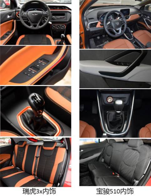瑞虎3x內飾風格更加年輕時尚、動感,特別是瑞虎3x車門把手樣式很精致,設計靈感來自曲棍球球桿,表現一種運動感。座椅顏色與內飾相呼應,采用橙色與黑色拼接,材質則是皮革與織物拼接;寶駿的內飾風格較為中庸、樸實。兩款車的方向盤都采用三幅式鏤空設計,在細節的處理上,寶駿510更追求視覺感覺,設計感更加時尚,而瑞虎3x則不僅重視設計感覺,握感也更加舒適。