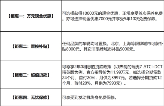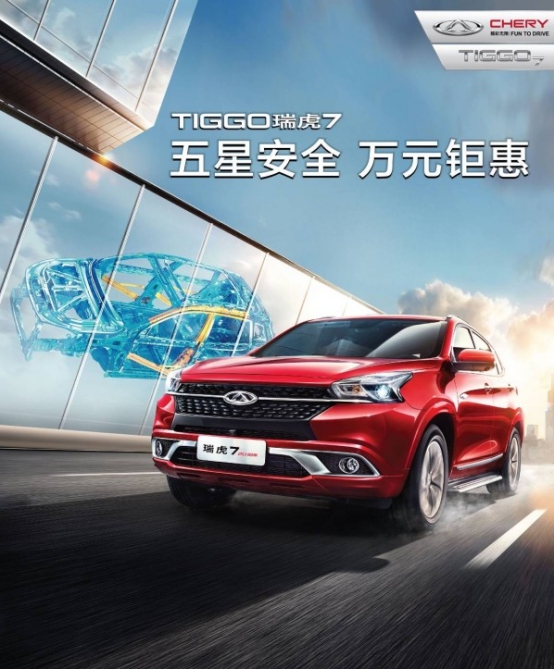 臨近歲末,春節將至,是時候送自己一份獎勵了。為了讓消費者更輕松擁有這款五星安全、兼最環保SUV,現在購瑞虎7尊享10000元現金鉅惠,置換還可額外享受5000-8000元補貼,金融貸款2年0利率,并享發動機終身免費保修!坐擁五星安全SUV就是這么簡單!