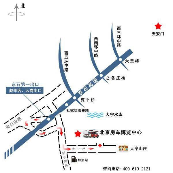 2.京港澳高速(北京)方向--13出口(云崗)---80米右轉—300米紅綠燈左轉—150米左側—北京房車博覽中心 GPS定位可以設定:北京市房山區大寧高爾夫或者大寧山莊 。
