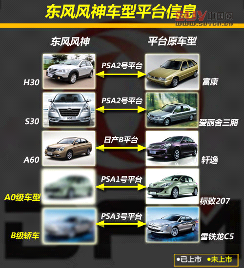 風神目前所生產的三款車型全部為緊湊型車,與其他同級品牌相比,較為單一的車型導致風神在市場中的占有率并不突出。風神現有乘用車采用東風合資品牌旗下的平臺打造,H30車型與S30共同開發于PSA2號平臺,而A60則出自日產B平臺,依靠現有的平臺技術,風神三款車型都在一定程度上復制了各平臺原型車的基因。面對這樣的局面,注重自主研發的東風風神計劃獨立開發一組新的平臺,在擴大產能的同時增加更加自主化的產品,風神計劃推出的首款SUV也將基于新平臺打造。