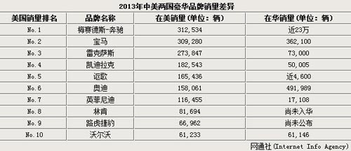 全球豪華車企競爭最為激烈的市場莫過于美國和中國,在購車需求上中美兩國也有著很大的區別。對此網通社統計了2013全年各大豪華車企的累計銷量數據后發現,在美熱銷的10大豪華品牌排名與中國的熱銷品牌形成鮮明的反差。其中美國市場最受歡迎的豪華品牌奔馳,在中國則滑落至第三;而美國市場銷量不佳的奧迪,在華的銷量數據卻整整翻了3倍,成為中國最受歡迎的豪華品牌。