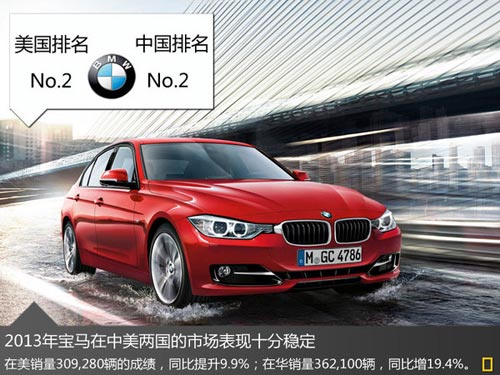 2013年寶馬再度奪得全球豪華車品牌銷量的桂冠,在競爭最為激烈的美國市場,寶馬以累積銷售309,280輛的成績,同比提升9.9%,僅次于梅賽德斯-奔馳品牌屈居第二。在中國市場寶馬品牌的銷量相比美國有所提升,全年銷售362,100輛,同比提升19.4%,增長幅度和銷量均高于美國市場。