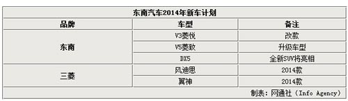 2014年,東南汽車要實(shí)現(xiàn)不低于2013年的增幅,也將推出多款新車,其中多數(shù)為改款車型:改款V3菱悅和V5菱致,2014款風(fēng)迪思和翼神,其中最引人矚目的當(dāng)屬其首款SUV-DX5了。