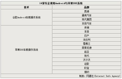 繼12家車企宣布將使用蘋果“ iOS in the Car”功能后,近日奧迪、通用等四大汽車品牌與谷歌組成“開放汽車聯盟”。網通社在對相關資料整理后獲悉:目前包括通用、奧迪的14家車企紛紛將車載系統進行“外包”,未來上述車企將基于安卓Android與蘋果IOS車載操作系統,提供更多更加方便的操作。