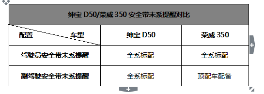 很多安全配置,在啟程出發前就要格外關注,例如,安全帶未系提醒、兒童座椅接口等。不少人乘車沒有系安全帶的習慣,尤其是副駕駛位置的人,直到聽見“嘀嘀嘀”的提示聲才意識到。很顯然,這種情況下,如果車輛不帶提醒功能,會間接影響乘員的旅途安全。對比來看,兩車均擁有駕駛員安全帶未系報警功能;不同的是,榮威350沒對副駕駛“一視同仁”,僅頂配版有副駕駛安全帶未系報警,紳寶D50是全系標配。