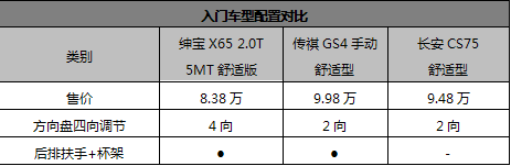 紳寶X65的這一動(dòng)作,無(wú)疑在刷新安全標(biāo)準(zhǔn)之后,又樹(shù)立了性價(jià)比的標(biāo)桿。以入門(mén)級(jí)車型為例。傳祺GS4手動(dòng)舒適型實(shí)際售價(jià)為9.98萬(wàn)元;長(zhǎng)安CS75舒適型優(yōu)惠后為9.48萬(wàn)元;紳寶X65 2.0T 5MT舒適版的廠商指導(dǎo)價(jià)為9.88萬(wàn)元,優(yōu)惠后價(jià)格為8.38萬(wàn)元。單售價(jià)而論,紳寶X65就比前兩者優(yōu)惠近萬(wàn)元,而在配置方面紳寶X65更為豐富,搭載了四向調(diào)節(jié)方向盤(pán)、Night Panel夜視儀表盤(pán)、外循環(huán)空氣過(guò)濾器以及音量隨速調(diào)節(jié)等功能。