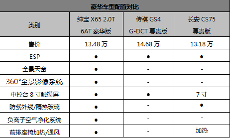 如果說(shuō)入門(mén)級(jí)車型代表的是性價(jià)比,那么豪華版車型就是車型實(shí)力的最高較量。紳寶X65自動(dòng)豪華型的售價(jià)為14.98萬(wàn),優(yōu)惠后價(jià)格僅為13.48萬(wàn),與長(zhǎng)安CS75價(jià)格持平,比傳祺GS4低1萬(wàn)多。在具體價(jià)值方面,紳寶X65配置更高。紳寶X65在豪華車型上搭載有1.25平方米的全景天窗、360°全景影像系統(tǒng)、胎壓監(jiān)測(cè)、負(fù)離子空氣凈化系統(tǒng)、座椅通風(fēng)等配置。而傳祺GS4和長(zhǎng)安CS75在這些配置方面簡(jiǎn)直少得可憐。由此可見(jiàn),在最新的優(yōu)惠下,紳寶X65不僅售價(jià)比同級(jí)車型低,配置方面還更豐富,真正讓消費(fèi)者“花更少錢(qián)獲得更多價(jià)值”。