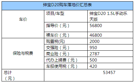 紳寶D20產(chǎn)品力好、性價(jià)比高,經(jīng)得起考驗(yàn),“金九銀十”、購(gòu)置稅減半、節(jié)能補(bǔ)貼等一連串的優(yōu)惠活動(dòng)力度很大,這個(gè)時(shí)候開回家中絕對(duì)是明智之舉。夏洛特?zé)溃贤醪粺溃I紳寶D20,就這么愉快的決定了!紳寶D20一直采取優(yōu)惠一萬元的政策,這最近又趕上了國(guó)慶前后各大4S店的促銷活動(dòng),又是優(yōu)惠價(jià)格又是送保養(yǎng),這樣算下來肯定會(huì)更省錢。以1.5L手動(dòng)樂天版為例,老王完全可以以4.68萬元裸車價(jià)拍板拿下。而且,前不久國(guó)務(wù)院決定,對(duì)購(gòu)買1.6升及以下排量乘用車實(shí)施減半征收車輛購(gòu)置稅的優(yōu)惠政策,紳寶D20可是妥妥的在內(nèi),所以本來該交4000元的購(gòu)置稅只付2000元就可以了!此外再加上950元的交強(qiáng)險(xiǎn),2787元的商業(yè)險(xiǎn),500元的代辦上牌費(fèi),420元的車船使用稅,總共算下來只要53457元,老王完全可以負(fù)擔(dān)得起啊!