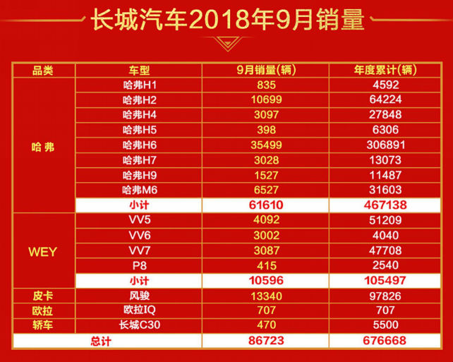 今年9月,長城汽車四大品牌全面發力,共計銷售86723輛汽車。其中,哈弗品牌9月共交付61610輛汽車;WEY品牌9月銷量再破萬輛,共售出10596輛;一直引領皮卡細分市場的長城9月共銷售13340輛皮卡車;就連品牌發布僅1個月的歐拉,也在9月成績單添上707輛的數字。如果說隨著整體市場的增長而增長是情理之中,逆勢下的增長才真正難得。那么長城又憑借什么從一眾車企中凸顯而出?