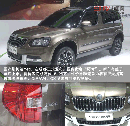 國產(chǎn)斯柯達(dá)Yeti在成都正式發(fā)布,國內(nèi)命名“野帝”。新車有望于年底上市,售價(jià)區(qū)間或?yàn)?8-25萬,性價(jià)比和競(jìng)爭(zhēng)力將有很大提高。