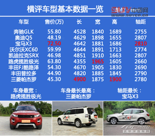 本期越野時(shí)代是不折不扣的大制作,我們一共聚齊了9臺(tái)50萬(wàn)級(jí)別的豪華SUV,據(jù)說(shuō)可以召喚出神龍了。9臺(tái)車在尺寸上也不不盡相同,首先德系三強(qiáng)中,奔馳GLK體量最小,奧迪Q5和寶馬X3則稍大;沃爾沃XC60、凱迪拉克SRX、豐田FJ則屬于中間水平;最大體格還要屬豐田普拉多和三菱帕杰羅哥倆。其中路虎攬勝極光三門版有著最短的軸距和最寬的車身,帕杰羅不僅車身最長(zhǎng)還最高,而軸距最長(zhǎng)的車型居然是寶馬X3,有些令人意外。