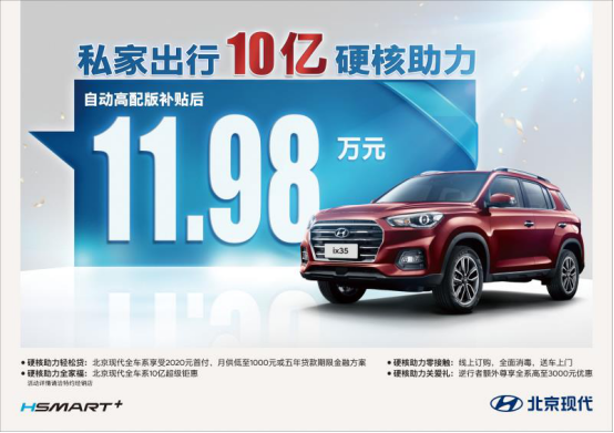在此鉅惠活動(dòng)中,北京現(xiàn)代不僅提供全車系享受2020元首付,月供低至1000元或五年貸款期限金融方案,還對(duì)針對(duì)旗下熱銷車型提供了“升級(jí)版”優(yōu)惠方式,新一代ix25、第四代途勝、新一代ix35三款熱門SUV車型更享購(gòu)置稅、全險(xiǎn)、三年利息全免的優(yōu)惠政策。