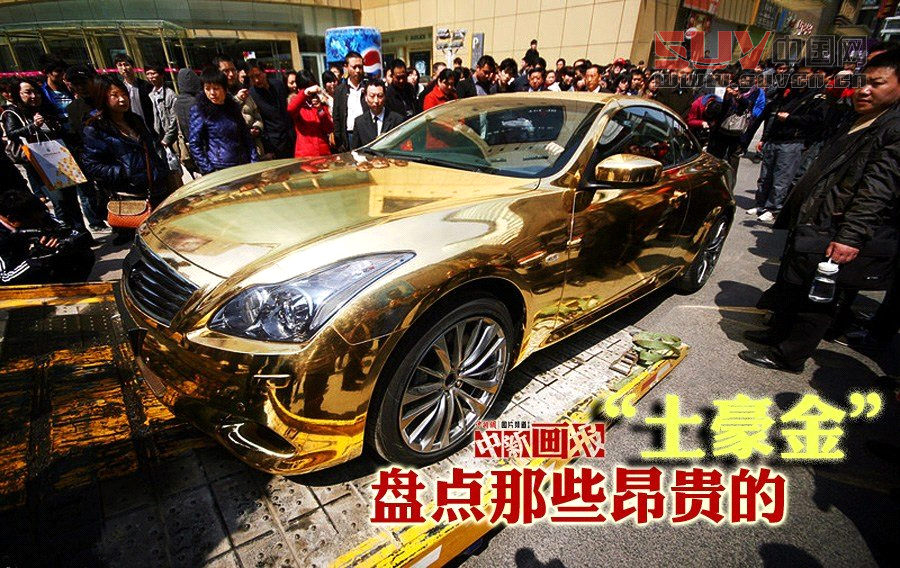 隨著新一代蘋果手機iphone 5s在中國市場受熱捧,其金色版本更是成為了不少人關注的焦點,很多人將其戲稱為“土豪金”,并成為網絡中的熱詞。隨后,各種版本的“土豪金”產品陸續進入人們視線,“土豪金”已不再是蘋果手機的代言詞,手表、鋼琴、馬桶、汽車、內衣、面膜……等等,這些“真金”物件也隨著“土豪金”的瘋狂,再一次被人們從“金色記憶”時代里挖掘出來,盤點那些昂貴的“土豪金”,看看什么才是高端大氣上檔次!圖為2011年3月29日,在南京新街口,一輛車身貼滿黃金的黃金跑車停在馬路邊上,車主停好車后隨即離去,過了約10分鐘,車被交警以違停拖走。