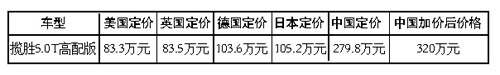 以攬勝5.0T最高配版為例,該車型在中國的定價(jià)為279.8萬元,經(jīng)銷商加價(jià)后的市場終端銷售價(jià)為320萬元。然而,該車在日本的定價(jià)折合人民幣為105.2萬元,在德國的定價(jià)為103.6萬元,在路虎的大本營英國定價(jià)為83.5萬元,而在美國,這款在中國賣到斷貨的車型定價(jià)僅為83.3萬元。
