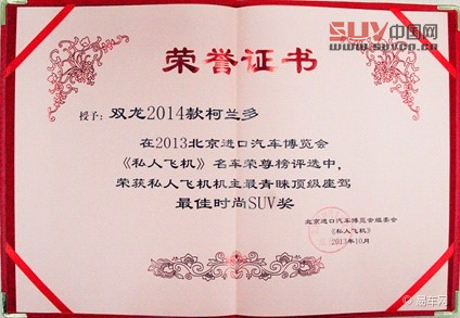銷售火熱的同時(shí),2014新款柯蘭多更在10月30日晚,在《私人飛機(jī)》名車榮尊榜評(píng)選中,榮獲私人飛機(jī)機(jī)主最青睞頂級(jí)座駕的“最佳時(shí)尚SUV”大獎(jiǎng)。龐大雙龍汽車銷售有限公司總經(jīng)理鄭天保表示:“自2014款新柯蘭多上市以來,熱銷勢頭一路看漲,深受廣大用戶喜愛。2014新款柯蘭多能夠獲得2013年度最佳時(shí)尚SUV車型獎(jiǎng),我們倍感榮幸。此次獲獎(jiǎng)無疑證明雙龍汽車的品牌理念:強(qiáng)健,專業(yè),品位牽動(dòng)著目光。雙龍汽車在中國這一全球重要市場,正贏得贊譽(yù),必將以獨(dú)特的設(shè)計(jì)和卓越的性能續(xù)寫成功”。