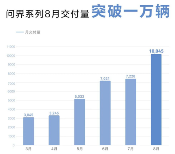 問界系列家族上市后深受消費(fèi)者喜愛,170天就完成超3萬臺(tái)交付。8月份,克服了缺芯、疫情、高溫、限電等因素影響,問界系列車型的交付量達(dá)到了10,045輛,創(chuàng)造了國內(nèi)新能源汽車品牌單月交付破萬最快的紀(jì)錄。問界M5 EV在上市后不到四小時(shí),訂單數(shù)已經(jīng)突破30000。
