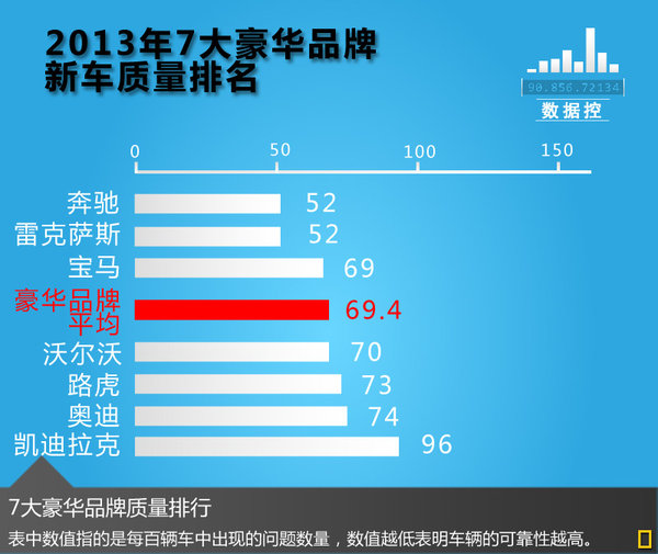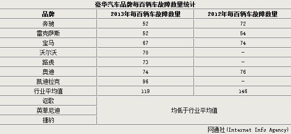 根據(jù)最新的豪華品牌車輛故障數(shù)量統(tǒng)計(jì)顯示,行業(yè)平均水平數(shù)值為119。而在網(wǎng)通社所選取的10大豪華汽車品牌中,位于行業(yè)平均水平之上的分別是:奔馳、雷克薩斯、寶馬、沃爾沃、路虎、奧迪及凱迪拉克7大豪華品牌,其中奔馳、雷克薩斯并列以52的成績排名行業(yè)第一。謳歌、英菲尼迪及捷豹這3大品牌則均未達(dá)到在行業(yè)平均值(或未被計(jì)算在內(nèi)),故下文將不會(huì)對(duì)上述豪華品牌重點(diǎn)敘述。