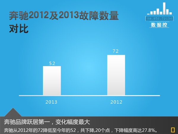 我們看到,在達(dá)到行業(yè)平均值的7大豪華品牌故障數(shù)量較與2012年或多或少的有所降低。其中變化最大的品牌則是今年躍居第一的奔馳品牌,其故障數(shù)量下降幅度高達(dá)27.8%,質(zhì)量提升非常迅速。隨著汽車質(zhì)量被越來越多的消費(fèi)者所重視,各大車企也正努力提升產(chǎn)品質(zhì)量,相信未來廠商在關(guān)注汽車外觀性、舒適性以及科技性的同時(shí),將為旗下車輛提供更加安全的保證。