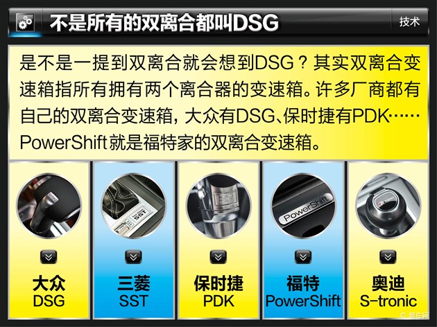 現今汽車科技越來越發達,雙離合變速箱也在越來越多的車型上得到運用,但很多人似乎只知道DSG是雙離合,并認為雙離合只有DSG。這個觀點其實是錯誤,現在就讓我們來了解DSG以外的雙離合——PowerShift,福特家的雙離合變速箱。