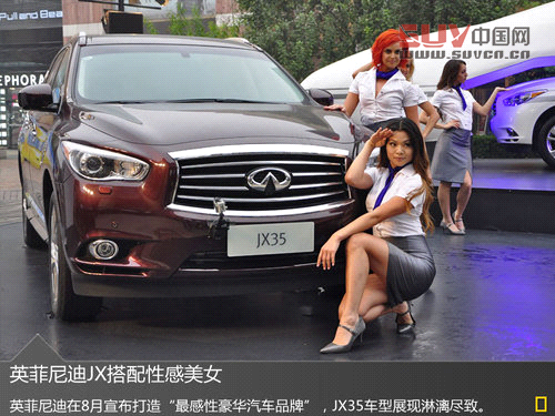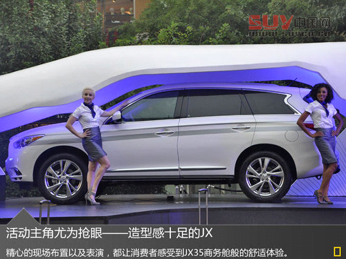 除了熱辣的舞蹈表演外,最吸引人眼球的還是本次活動的主角—JX。其獨(dú)特的的新月形D柱設(shè)計(jì)是英菲尼迪JX35外觀的一大亮點(diǎn),兼顧美觀的同時,也能夠?yàn)榈谌懦丝蛶砀蟮膫?cè)窗視野。簡約的發(fā)動機(jī)艙蓋造型以及流暢的車身線條體現(xiàn)出力量與美感的結(jié)合。