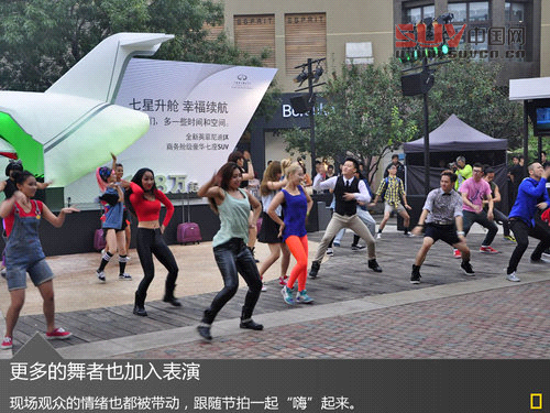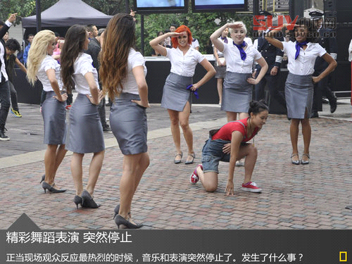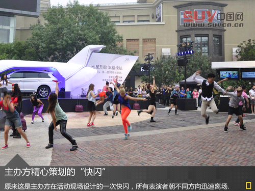 當(dāng)現(xiàn)場觀眾的情緒被完全調(diào)動時,舞者們連同動感的節(jié)奏都突然停止,到底是怎么回事呢?原來是主辦方特意安排的一次“快閃”行動。“快閃”是新近在國際流行開的一種嬉皮行為,約定人在明確指定的時間同時做一個指定的不犯法卻很引人注意的動作,然后趕快走人。