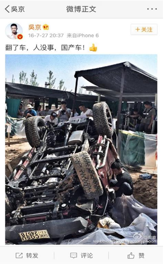 遭遇翻車后,吳京對北京(BJ)40的安全性表示肯定 圖片源自吳京本人微博