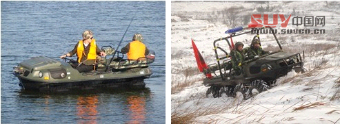 西貝虎水陸兩棲全地形車兼備全地形車、水陸兩棲越野汽車及其他車輛綜合性能的新一代車型。該車型為北美地區生產的水陸兩棲全地形車的改進升級型,由本公司與中國人民解放裝甲兵工程學院合作開發的新一代全地形車型,該車采用8×8、6X6全輪驅動、差速制動轉向、鏈條傳動、無極變速、全密封車體、水上螺旋漿推進設計,具有40度爬坡、原地180度轉向、45公里/小時陸地高速行駛及±40ºC超常規環境下正常啟動并連續長時間作業的能力,并能在各種復雜地形中穿梭自如。“西貝虎”水陸兩棲全地形車的主要技術特點、性能指標如下: