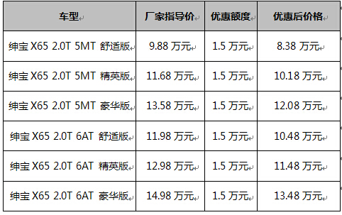 在SUV市場持續火爆的背后,大部分SUV產品的優惠幅度并不大,比如哈弗H6僅優惠6000,長安CS75也僅是幾千元禮包的形式來促銷。經銷商機關算盡,加入各種虛高的保養、裝飾之后,才能勉強擠出一個萬元以上的“綜合優惠”。而紳寶X65則一步到位,將現金優惠的額度提高至1.5萬元。