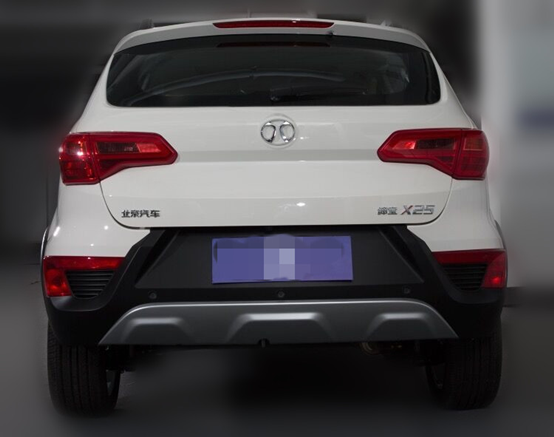 尾部造型采用了與奔馳A級相類似的設計風格,尾燈造型同樣輪廓分明,大量的折角棱線的運用,與前臉保持同樣的硬朗風格。“北京汽車”和“X25”的鍍鉻標識分列尾箱門兩側下沿,表明了該車的身份。排氣管隱藏在銀色護板下,讓車尾部顯得非常利落。