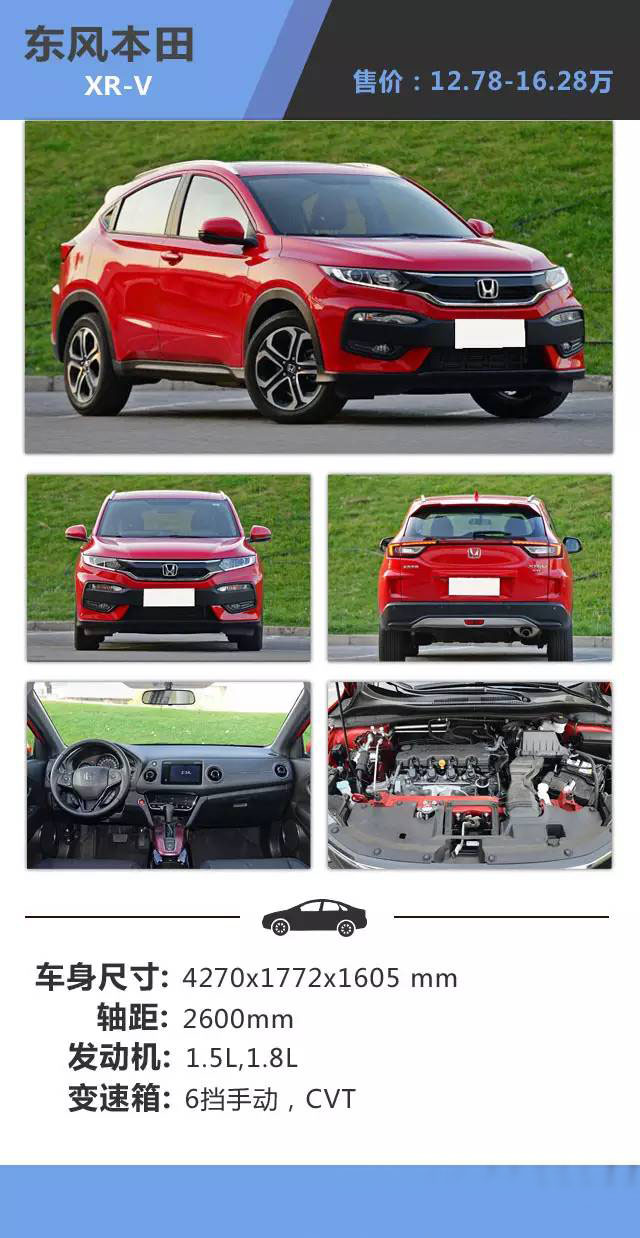 點評:XR-V剛上市的時候相信會讓很多人驚艷,其采用本田家族化的設計,不過卻極具特色,大燈與鍍鉻一體化的設計視覺效果非常好,而其燈光系統采用分層的設計,顯得其前臉立體感十足,內飾采用不對稱的設計,配備中控大屏,整體顯得簡潔清晰明了,增加了人車的互動性,車尾方面貫穿其中的尾燈設計頗有未來味道,車內的乘坐空間得益于本田的MM理念,大家不用太大的擔心,滿足日常需求是沒有問題的。