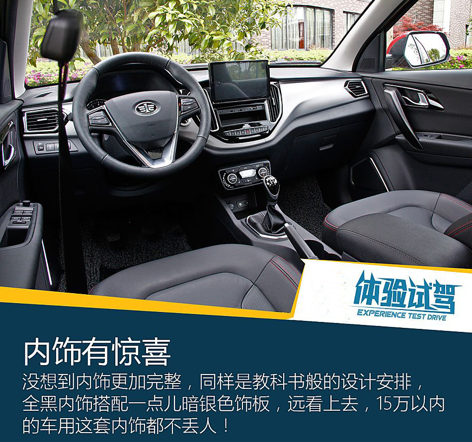 內飾更加完整,同樣是教科書般的設計安排,全黑內飾搭配一點兒暗銀色飾板,遠看上去,15萬以內的車用這套內飾都不丟人!只是誰來給我解釋一下中控區的雜亂無章?我知道一汽是好意,拿出這么大的屏幕,同時還做了儲物格+各種接口。但層次安排上真的沒有更優方案了嗎?