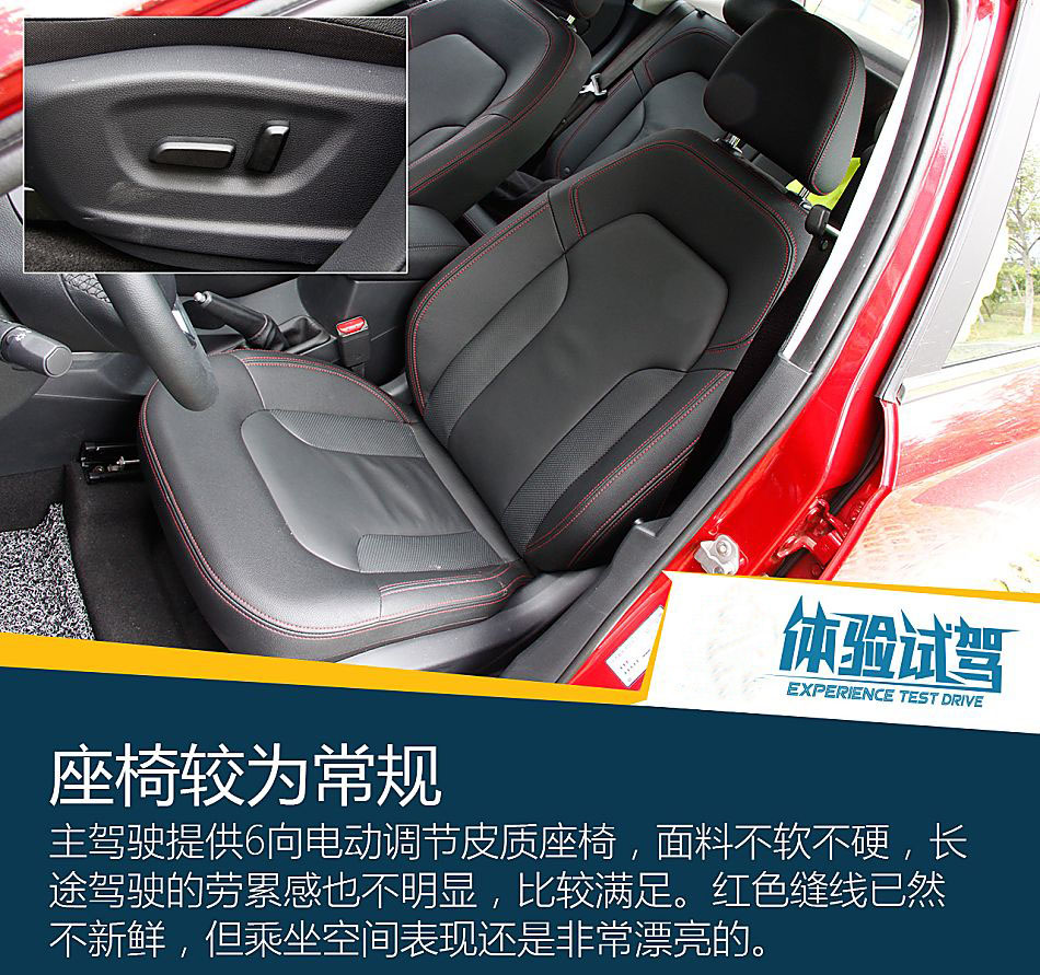 景逸X3的座椅支持6向手動調節。前排座椅可以調節的范圍較大,不同身材的駕駛者很容易就能夠找到適合自己的坐姿,橫向空間也并不顯得擁擠。身高172cm的模特在調整到適合自己的坐姿之后,頭部距離車頂尚有1拳多的空間。后排座椅的尺寸、靠背角度都較為合適,正常情況下腿部空間可以達2拳以上。