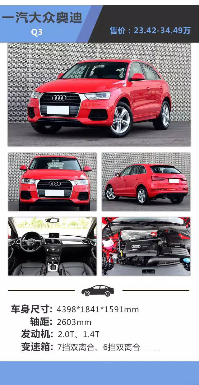 點評:Q3是這三款車型中最小的一輛,為什么要推薦這款車呢?教授覺得,或者你可能不需要這么大的車型,那么1.4T的奧迪Q3是很適合你。體型看上去沒那么龐大,所以這款車多了一份的時尚感,相信這款車會挺適合潮人去擁有。奧迪Q3的外觀內飾相信也不需要教授多講,還是同樣的配方還是同樣的味道。動力方面,1.4T匹配奧迪的6速雙離合,0-100公里加速只需要9.2秒,因為Q3是三款車中尺寸最少,所以數字并不是那么驚艷,不過大眾系的雙離合確實做得比較出色,基本上很難找到與之匹敵的同價位雙離合。