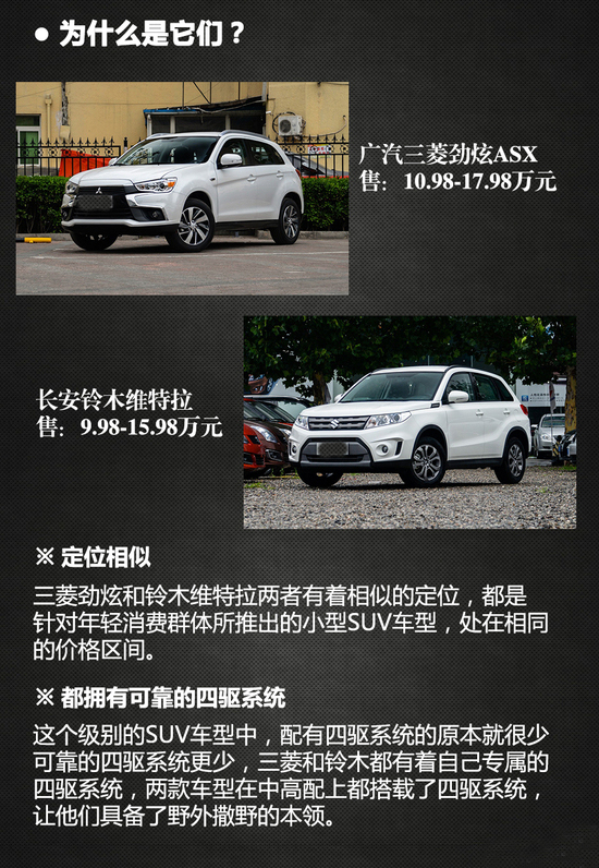 當下許多年輕消費者購車已經不在受固有思想的束縛,他們年輕充滿活力,具有冒險精神,那么酷勁十足的外觀加上能走野路的本領剛好符合他們的需求。三菱勁炫和鈴木維特拉充分的詮釋了什么才是夠勁夠野的小型SUV,兩者都有著玩酷的外觀和可靠的四驅性能,它們都是為了迎合年輕消費者而來,那么兩者相似的車型屬性也就很難避免一場針鋒相對的較量。