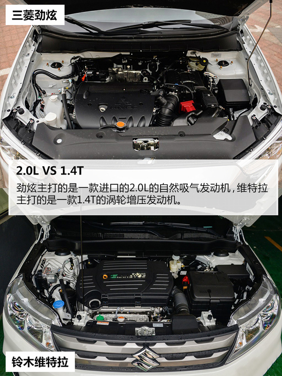 兩者的外觀都有著能吸引年輕消費者眼球的資本,但兩者又分別有著自己的風格,勁炫偏向時尚動感,維特拉偏向硬派作風,其實這兩種不同的風格也代表了兩個品牌的設計取向,就想三菱能夠將歐藍德那樣大尺寸的SUV設計出靈巧動感的視覺感一樣,勁炫也是出于這樣的設計風潮之下,相同的,我們從鈴木的吉姆尼那樣的小車身上仍舊能看到剛勁有力的一面,那么維特拉自然也傳承了這樣的衣缽。從車身尺寸來看,三菱勁炫有著準緊湊級的車身尺寸,而維特拉要偏小一些,不過我認為車身尺寸對于選擇這兩者的消費者來說應該不會太過于重要,畢竟該級別車型還是以年輕人單人或者雙人駕駛為主。