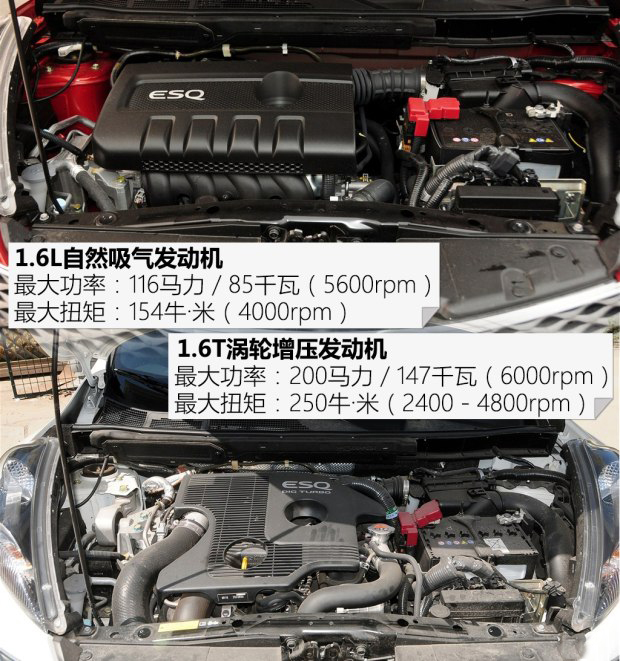 ESQ為消費者提供搭載1.6L和1.6T兩款發動機,與發動機匹配的都是CVT無級變速箱。這么一個個性運動的小型SUV,我覺得1.6T更適合它的身份,動力強,稍微改改就能變成個小鋼炮,看著開著都更帶感一些。
