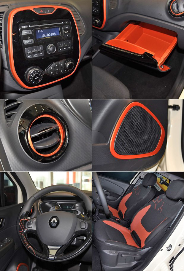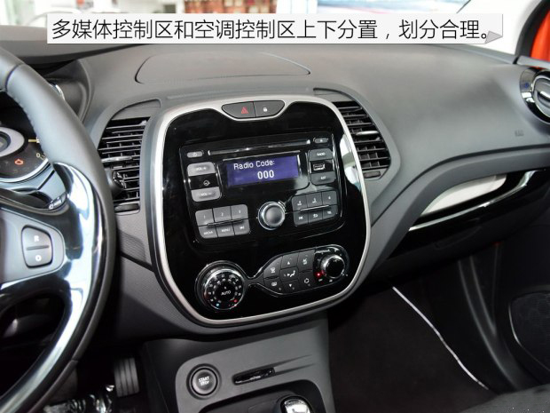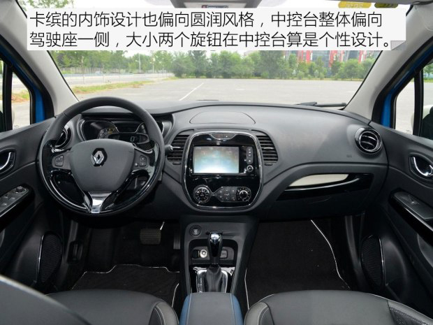 法國車的設計都會加入一些獨特的地方,卡繽也不例外。第一眼看它的內飾會讓人有些不適應,你很難找到我們熟悉的對稱設計,各種形狀拼接起來的內飾看起來更隨性一點,有一定設計感。中控臺的主色調為黑色,消費者還可以選擇黑色、橙色和藍色三種顏色將內飾點綴。選裝的顏色出現在中控臺、手套箱、空調出風口、揚聲器、方向盤和座椅,為內飾增加了看點。