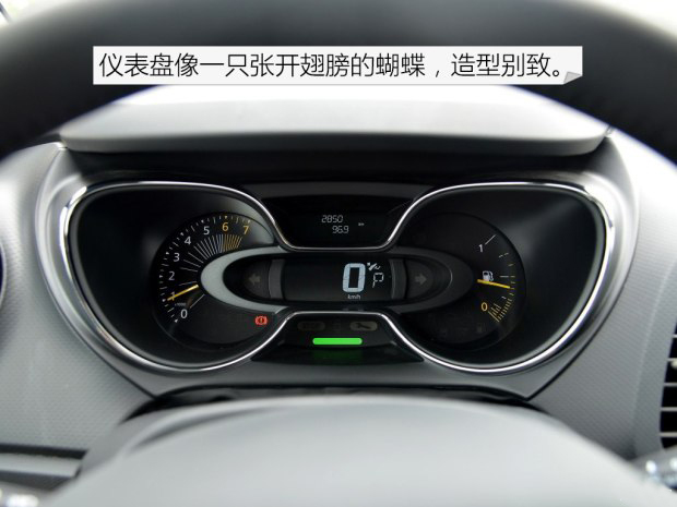 卡繽的儀表盤值得一提,這樣類似蝴蝶的造型我們不多見,它沒有采用機械時速表,而是用了電子時速顯示在儀表盤上,而且轉向燈的占用面積也很大,這種非常規的造型也為它的個性加分。