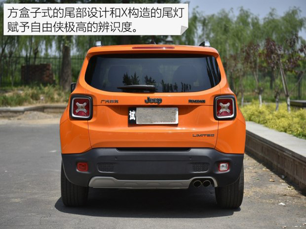 從車尾看去,自由俠繼續硬朗的一面。它的倒車燈和剎車燈融合一起,倒車燈選用X構造,點亮后辨識度非常高。這種X造型的設計靈感來源于自由俠的前輩-威利斯,威利斯的外掛式軍用油箱上有一個大大的X標志。