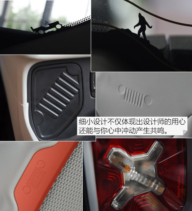 這套由年輕設計師創作的內飾獲得了2015年的“沃德全球十佳內飾”,它采用了大膽的撞色設計,并為消費者提供三種不同風格的內飾配色,對空調出風口、揚聲器、擋把、前排杯架、座椅邊角進行色彩點綴。而最打動人心的是內飾的細節設計。七孔式進氣格柵和原燈的復古造型、前擋風玻璃上攀爬的威利斯、后擋風玻璃上的小野人、模仿外掛軍用油箱的X造型,這些小小的標志讓它個性的味道更足了一些。