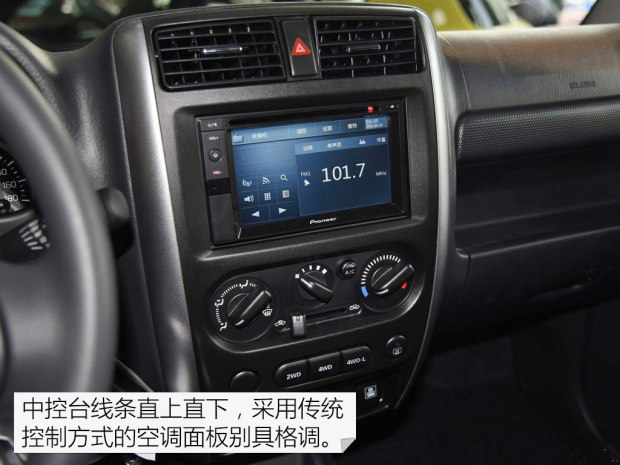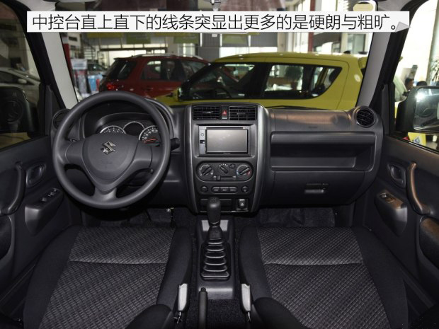 吉姆尼的內飾也是最傳統的簡約風格,黑色的內飾與粗曠的線條讓它和時尚、精致這些詞匯毫不沾邊。不過這并不影響什么,關鍵時刻不掉鏈子才是真的。中控臺功能區域劃分合理,從上到下依次為空調出風口、中控大屏、空調控制區和分時四驅按鍵。其中空調內外循環轉換的還是傳統的拉桿形式,喜歡它的人不會在乎這點。