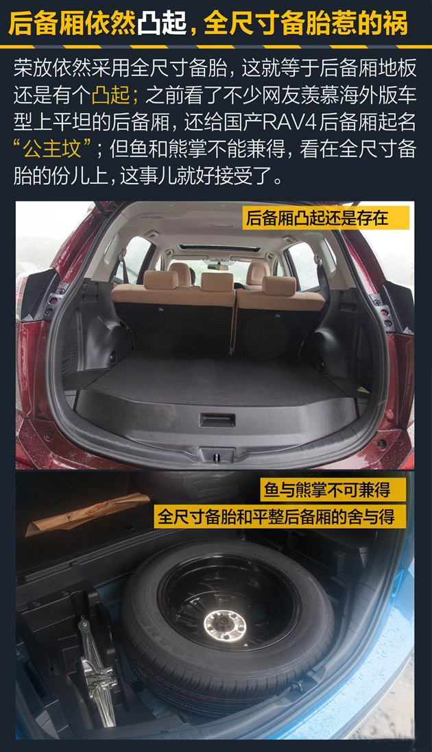 空間方面,我們以身高177cm的體驗者來看,當其坐在前排時可獲得約一拳的頭部空間。當前排座椅位置保持不變時,在后排可獲得約一拳的頭部空間及兩拳的腿部空間。至于后備廂空間方面,RAV4榮放由于采用了內置全尺寸備胎,所以其后備廂地板相比其他車型有著非常明顯的凸起。全尺寸備胎OR后備廂裝載性?,這確實是一道痕糾結的選擇題。